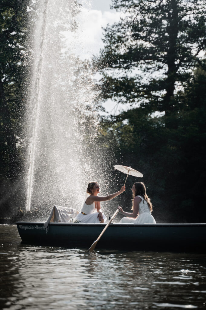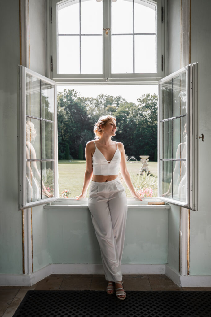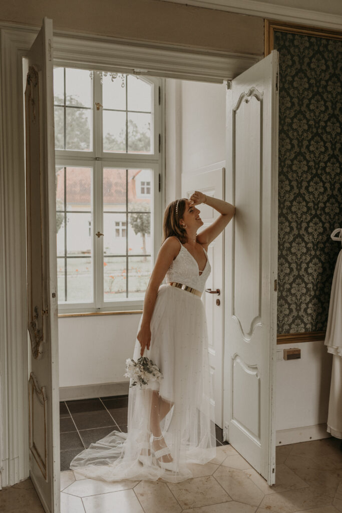 Konkret könnte eure Brautmode-Strategie so aussehen: Startet mit einem bodenlangen, fließenden Tüllrock zartem Ivory, kombiniert mit einem Spitzenbody für die Zeremonie. Nach dem offiziellen Teil und den ersten Fotos wechselt ihr zu einem kurzen Tüllrock mit leichtem Überrock für dne Empfang im Schlossgarten. Zum Tanzen könnt ihr dann optional einen kürzeren Rock oder eine elegante Hose kombinieren. Diese Mix & Match Teile sind nicht nur praktisch für eure Hochzeit, sondern auch nachhaltig: Der Spitzenbody lässt sich später zu besonderen Anlässen tragen, der Tüllrock wird zum Styling-Highlight bei anderen Events. So verbindet ihr die romantische Atmosphäre dieser Hochzeitslocation mit einem durchdachten, modernen Brautlook.