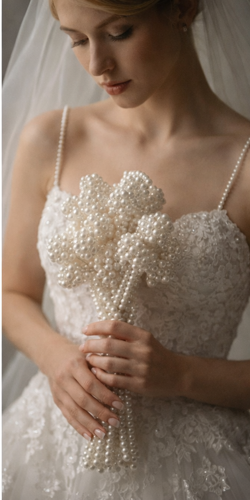Perlen sind zurück, aber deutlich reduzierter und gezielter eingesetzt. Typisch für 2026 sind feine Perlenketten entlang des Dekolletés. Diese sind direkt ans Oberteil genäht Der Unterschied zu früher liegt also in der Platzierung.